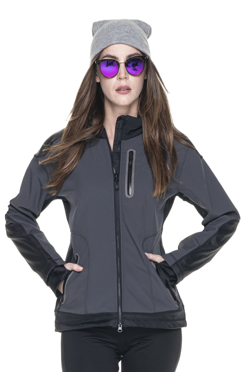 Opis: damska oddychająca kurtka z membraną; materiał typu softshell połączony z polarem;